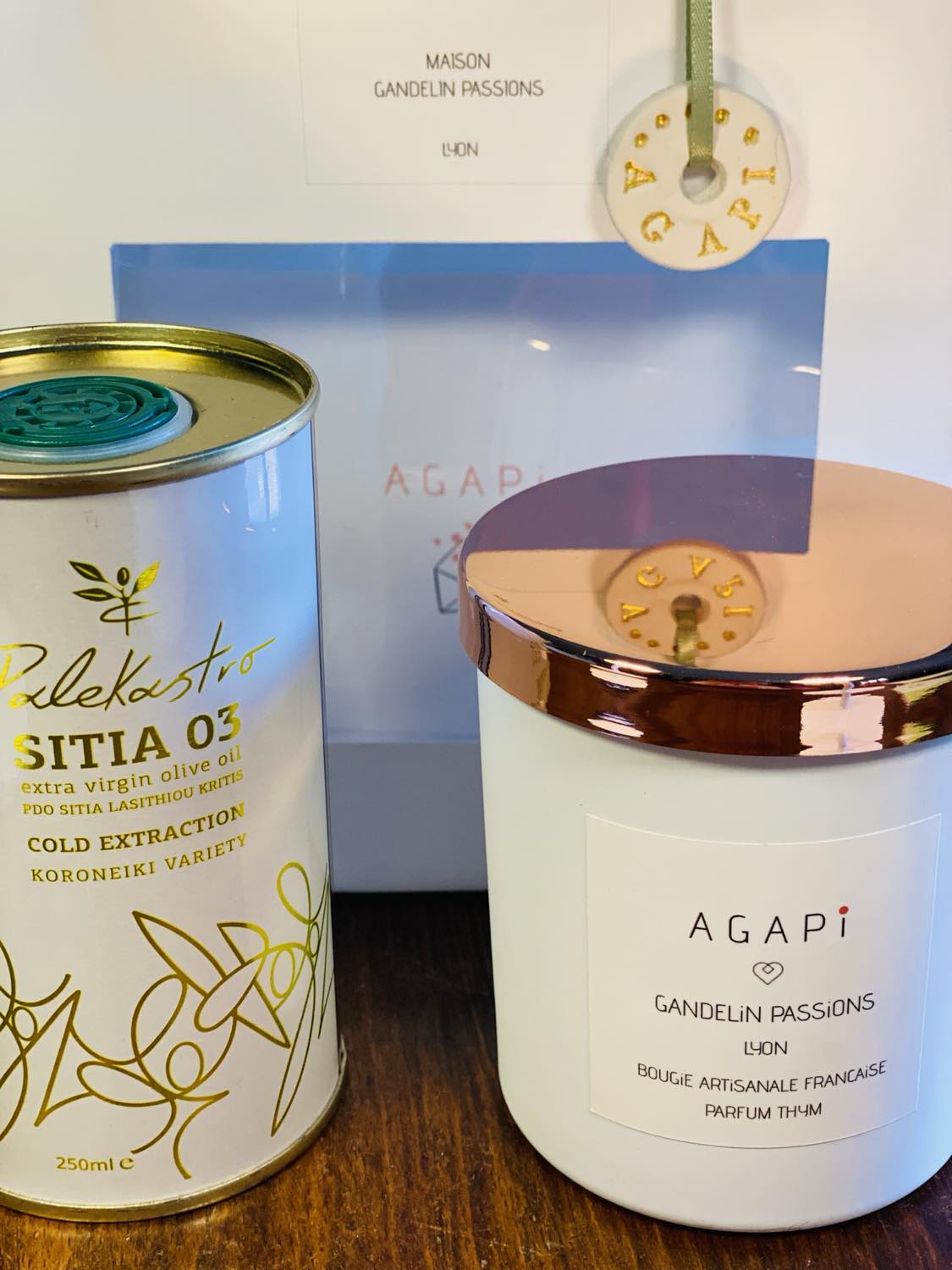 La bougie AGAPI et petit bidon d’huile d’olive crétoise AOC SITIA